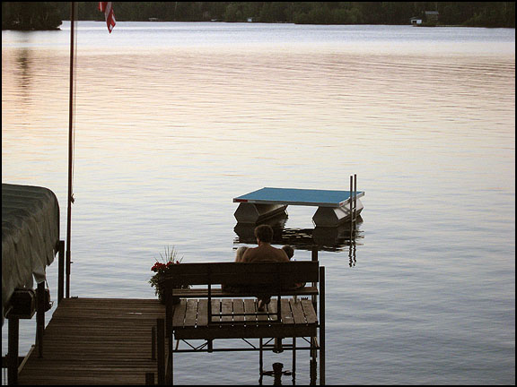 ("Picture of grampa with grandkids at the end of the dock."