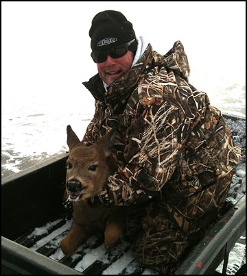 It never attempts to escape and actually relaxes as if it realizes that we're it's only hope. A somewhat incredulous Chad Mesojedec watches this unfold and cheers as we lift the deer out of the sled, set it on shore, and it bounds off, worn out but otherwise unharmed and holding it's head high.