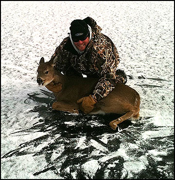 He picks me up, we ride up and there it is on the ice, legs splayed at awkward angles, exhausted from it's futile attempts to stand. There's no snow on the ice and it can't get any foothold with it's hooves. As I walk up I hand Paul my iPhone and say, "This is unreal. We need some pictures." The deer is very scared and wheezing like an asthmatic while still attempting to stand. I reach down and grab ahold of the deer and literally pet it like a dog. As it relaxes, I feel it's heartbeat slow. Paul walks over and grabs ahold of the front end and I the back and we hoist the deer into the sled/trailer.